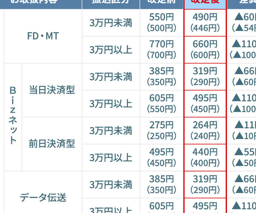 - 振込手数料の異なるタイプ: 新規振込、急ぎの振込などで追加料金が発生