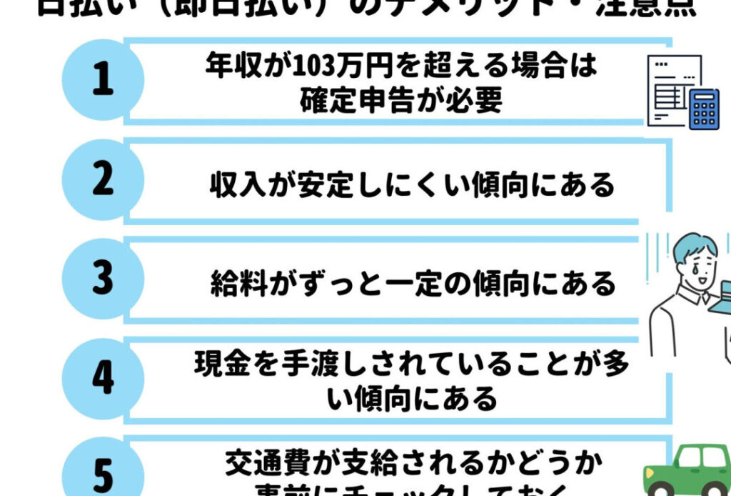- 週払い:一部のアルバイトでは、毎週給料が支払われる。この制度は特に高校生や大学生に人気がある。