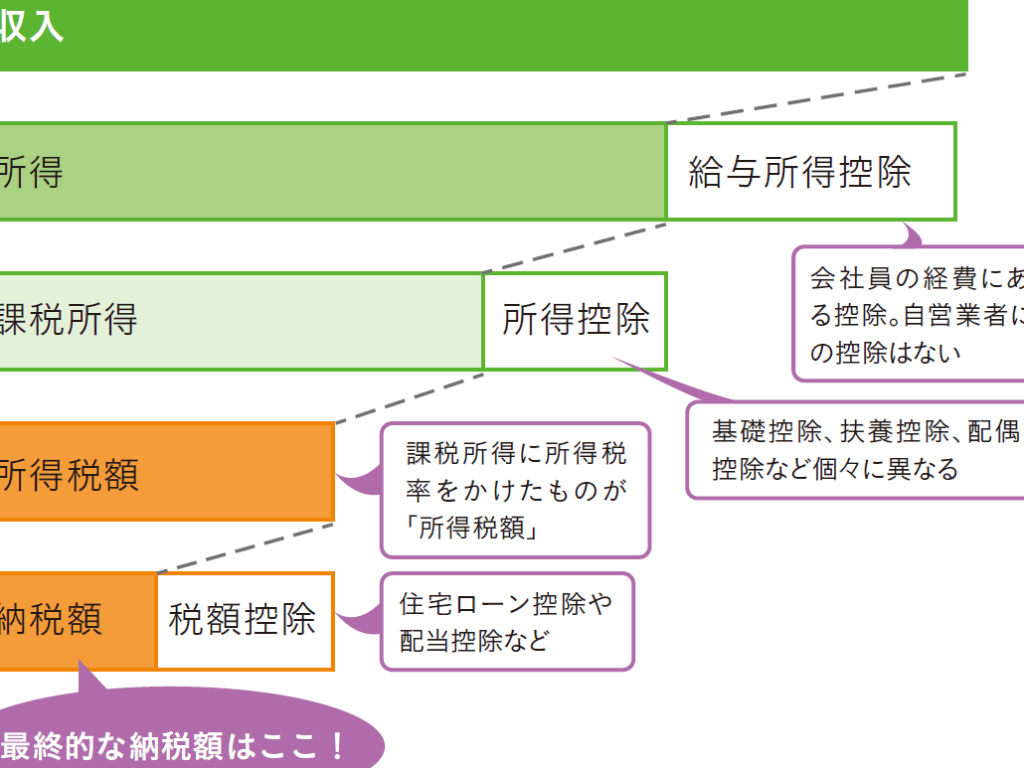- 所得税の計算: 所得金額から各種控除を引き、課税所得を求める。その課税所得に税率を掛けて納付すべき税金を算出する。