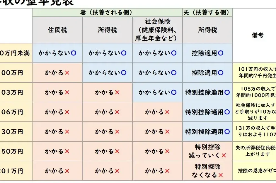 - 計算基準: 扶養のための収入上限は、年間103万円。ただし、特定扶養控除の場合は、特定の年齢要件を満たす必要があります。