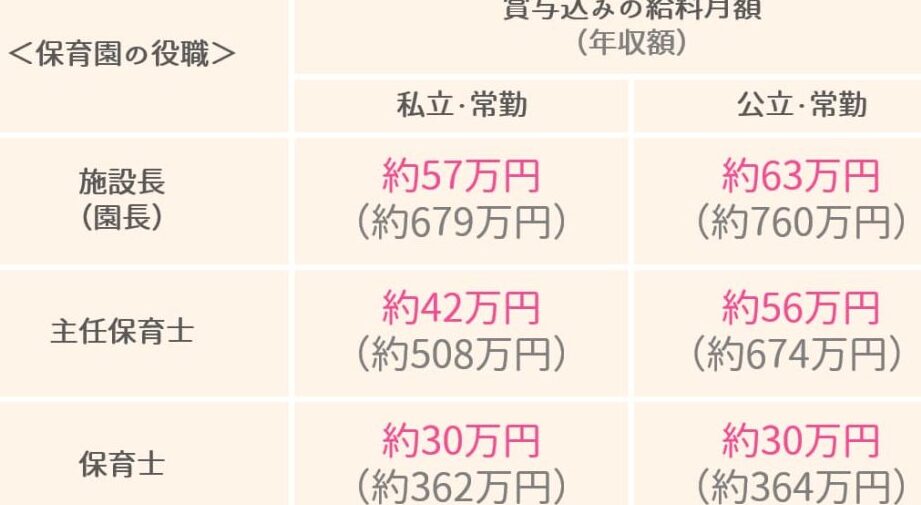 また、私立保育園では、保護者からの保育料の額が給料に大きく関わります。私立園の給料は、公立園と比較して変動することがあります。私たちが確認したデータによれば、2021年度の保育士の給与の平均は約30万円ですが、私立と公立で差が生じる場合もあります。