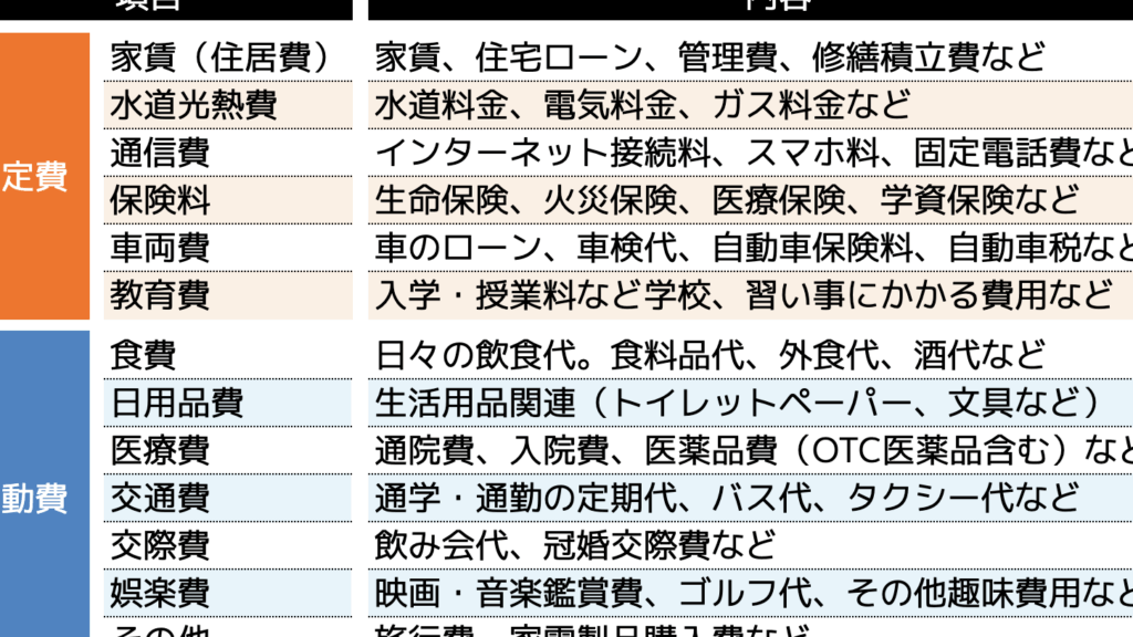 - 固定費の算出: 家賃や光熱費などの固定費をリストアップし、毎月の支出を把握します。