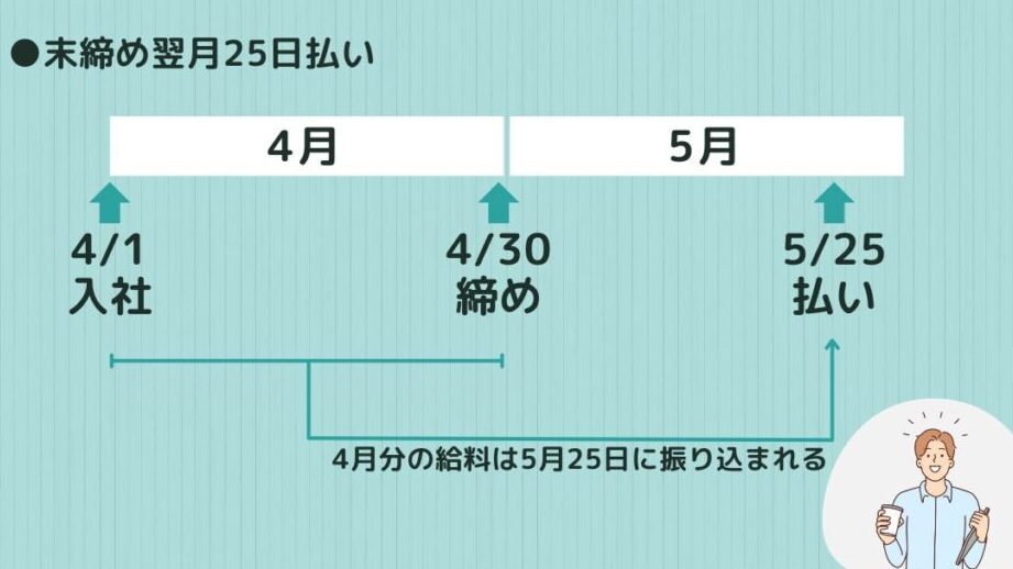 - 入社日によって初回の給料も変動する。例えば、4月や10月の初めに入社した場合、初回の給料はその月の末に支給されることが多いです。
