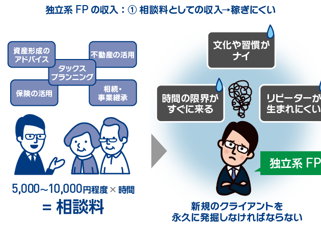 フリーランスのファイナンシャルプランナーは、クライアントから直接フィーを受け取るスタイルが主流だ。この場合、報酬の体系は以下の通り:
