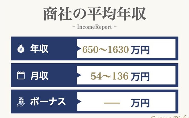 - 金融業: 金融業と同様に高収入を狙えるが、商社は独自のビジネスモデルによって、安定した報酬を維持している。