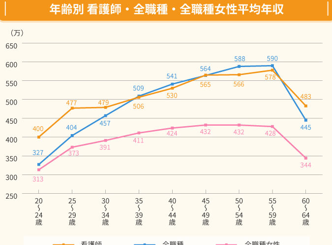 日本の看護師の平均年収は約500万円から600万円である。ここには、経験年数や勤務先による違いがある。例えば: