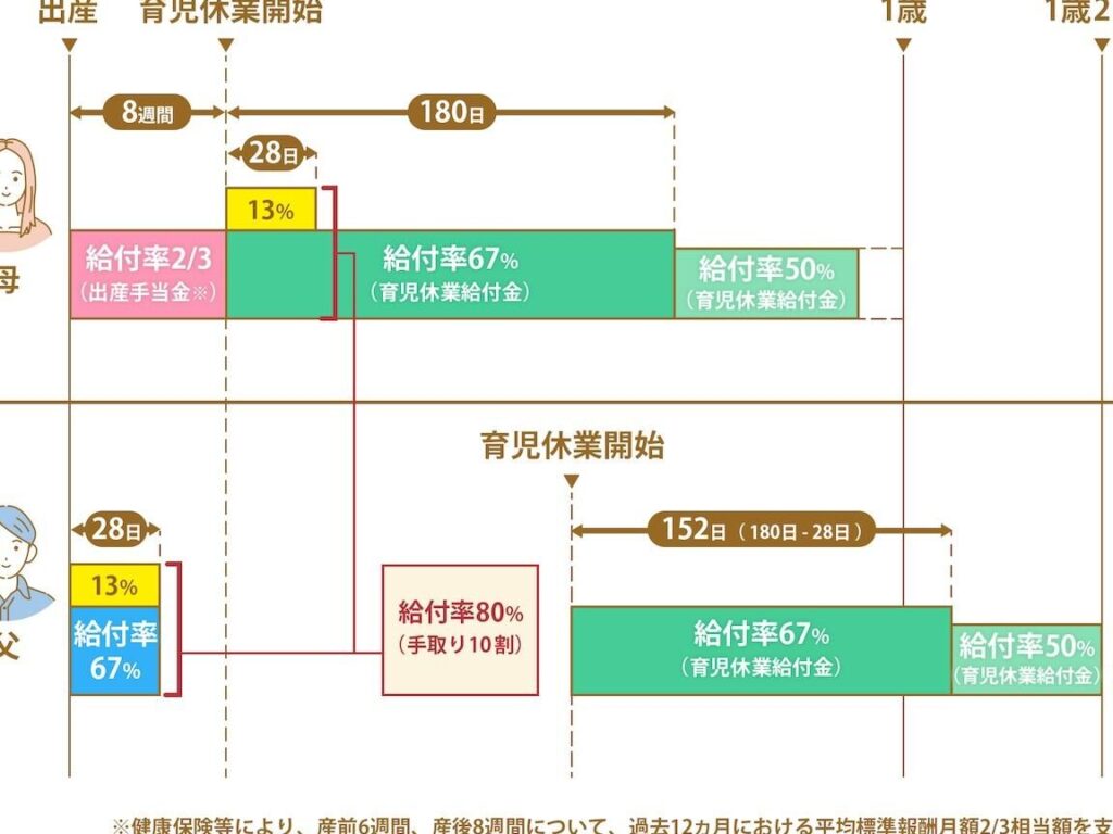- 月給の67%: より具体的には、育児休業の開始から支給され、上限は月給の67%です。