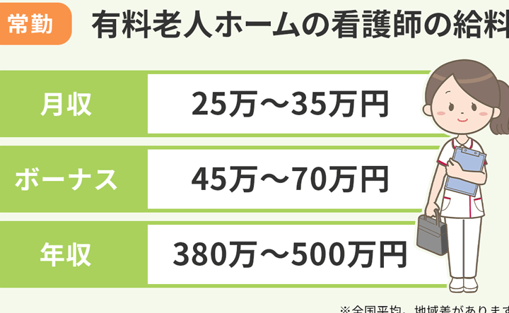 有料老人ホームで働く看護師の平均給料は、年間約420万円から500万円程度です。この金額には、基本給や各種手当が含まれます。具体的な給料の内訳は以下の通りです。
