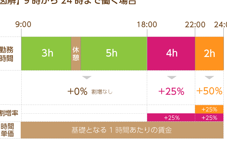 - 基本給 × 深夜勤務時間 × 深夜手当率 = 深夜給料